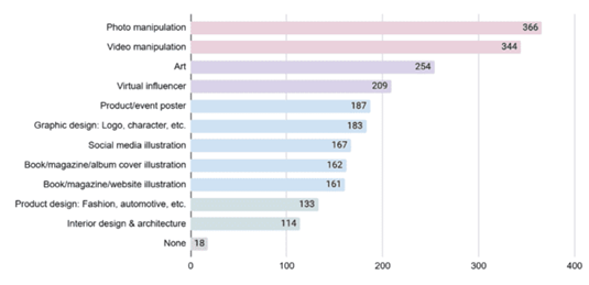 Regarding uncanniness, the survey provides tick boxes to note which GenAI application makes the respondents uncomfortable. The result is presented in Figure 4, with photo and video manipulation scoring the highest, specifically when used to manipulate other people’s images without their consent. With the addition of virtual influencers, these three resemble the uncanny valley theory, proving that there is indeed a threshold of accepted realism.